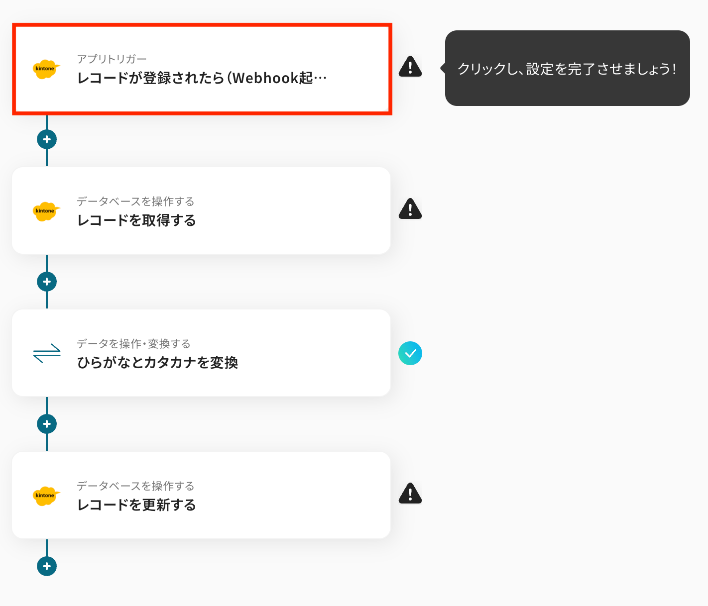 ここからは、kintoneにレコードが追加されたら指定したフィールドのひらがなをカタカナに自動変換するフローを解説します。