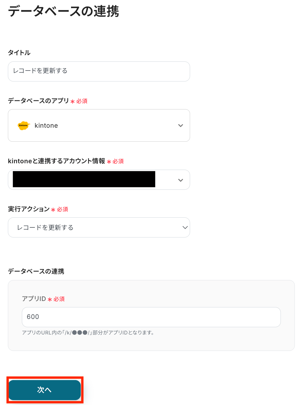 アプリ情報・アカウント情報・アクション「レコードを更新する」を設定します。
