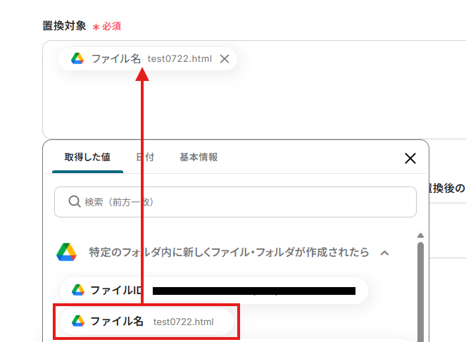 「置換対象」は、入力欄をクリックして表示される取得した値から選択してください。