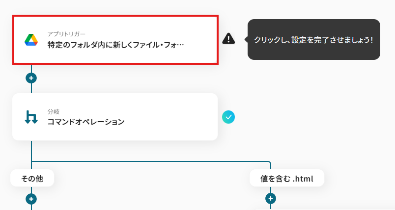 オペレーションに「特定のフォルダ内に新しくファイル・フォルダが作成されたら」、取得した値に検知したい項目を設定します。
