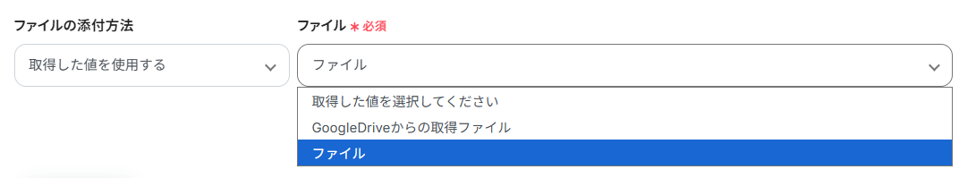 「ファイルの添付方法」「ファイル」は、プルダウンから選択してください。
