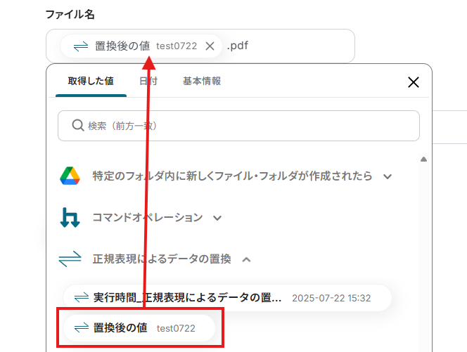 「ファイル名」は、入力欄をクリックして表示される取得した値から選択してください。