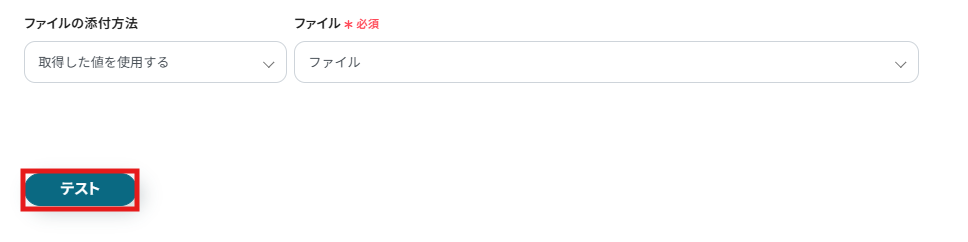 ファイルの添付方法は「取得した値を使用する」「ファイル」として「テスト」をクリックします。