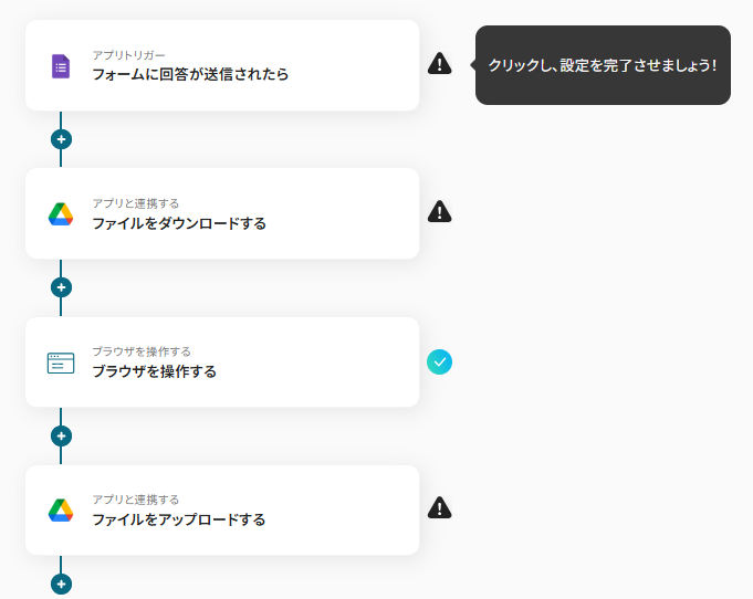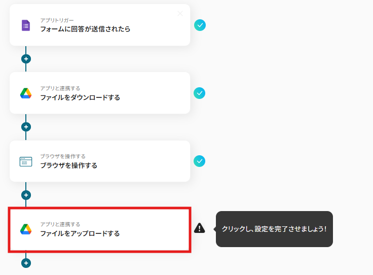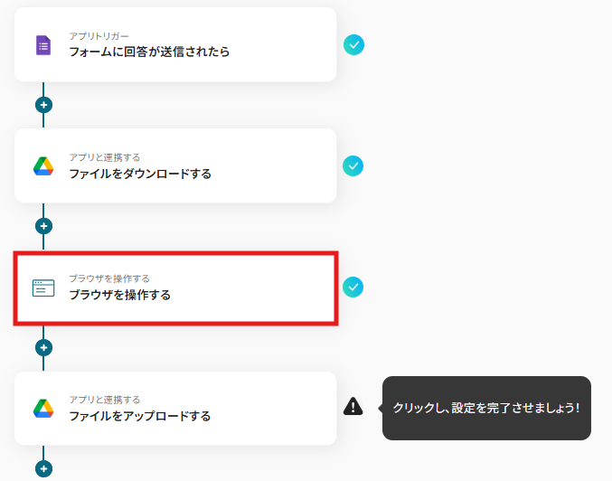 これで【Googleフォームで受け取った画像をRPAでPDFに変換して、Google Driveに格納する】というフローが完成です。