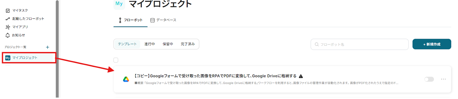 また、コピーしたテンプレートはマイプロジェクトに保存されているので、マイプロジェクトからも開くことができます。