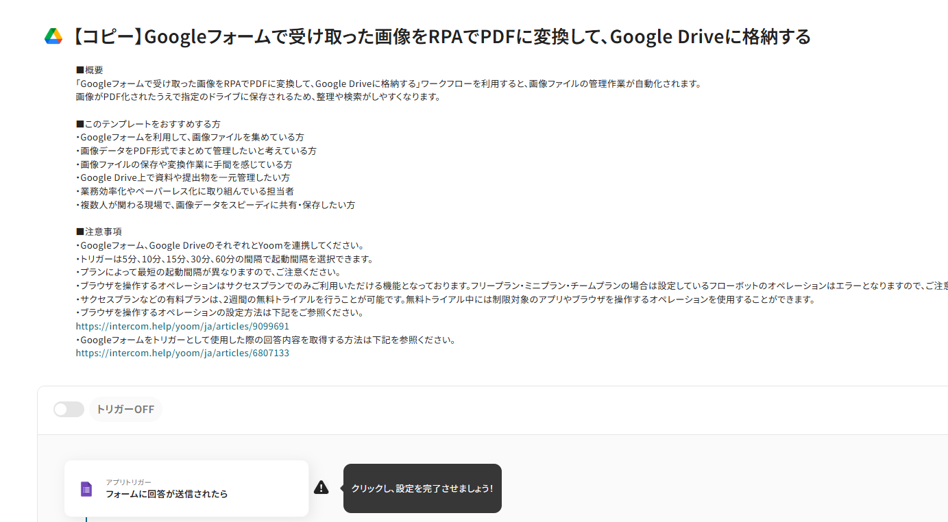 - Googleフォームのトリガー設定、RPA・Google Driveのアクション設定