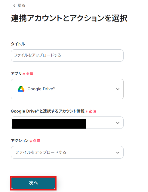 2) アクションは「ファイルをアップロードする」を選択して、「次へ」をクリックします。