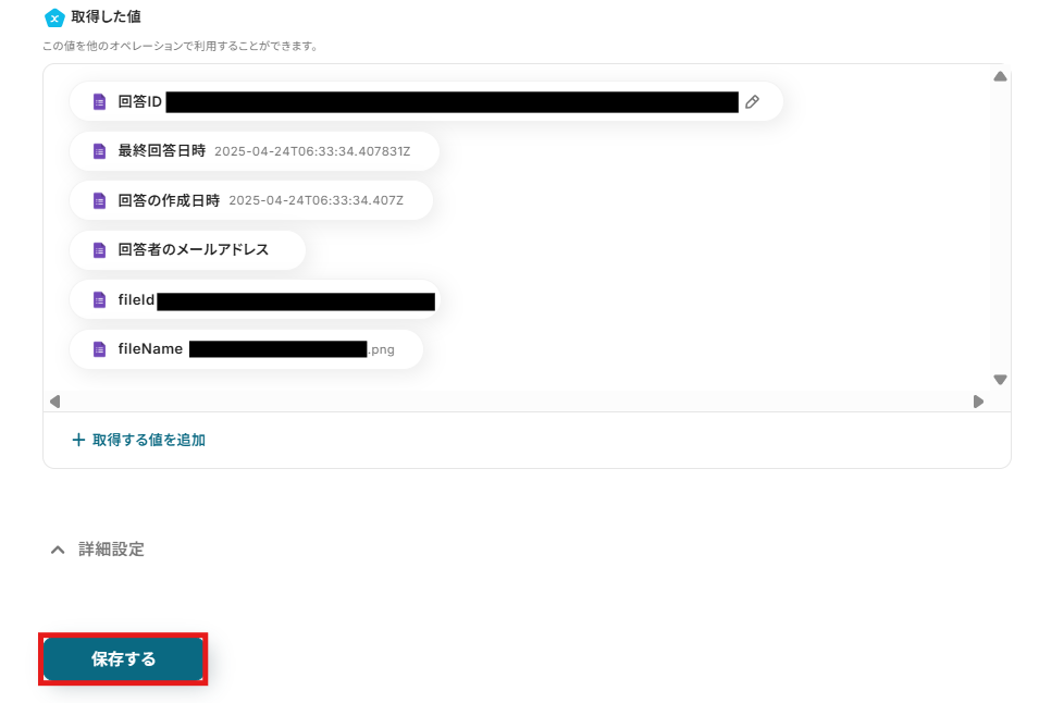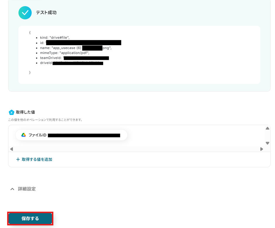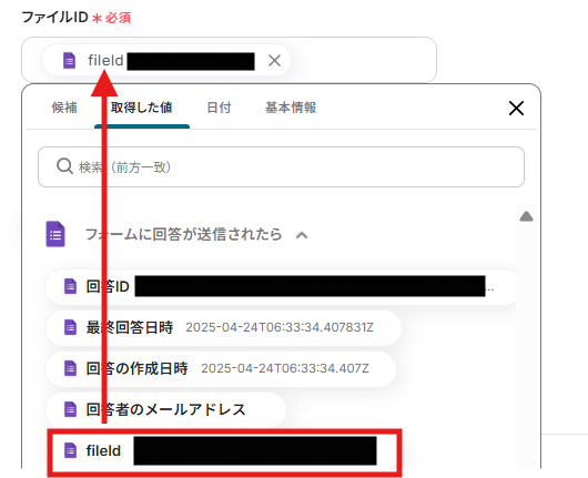 格納先のファイルIDはボックスをクリックすると連携済みのIDが表示されるので候補から選択してください。