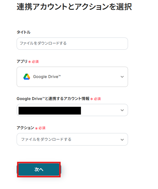 2) アクションは「ファイルをダウンロードする」が選択されていることを確認し、「次へ」をクリックします。