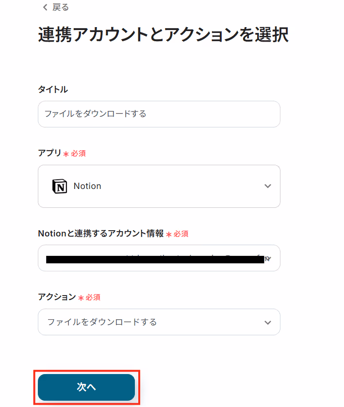 連携するアカウント情報には、ステップ1で連携したアカウント情報が反映されています。トリガーアクションはそのままにして、「次へ」をクリックしてください。