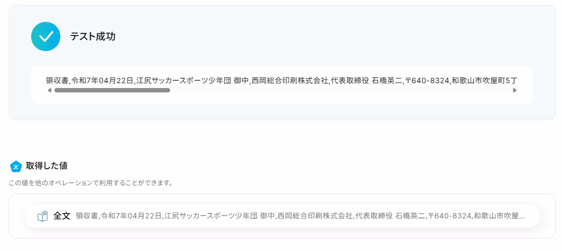 5.入力を終えたら「テスト」をクリックし、「取得した値」にデータが抽出されていることを確認してください。