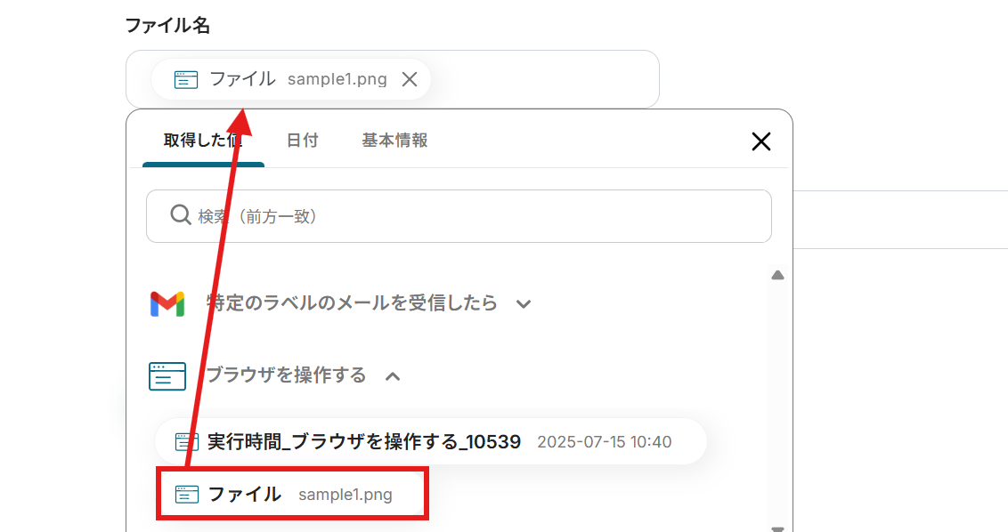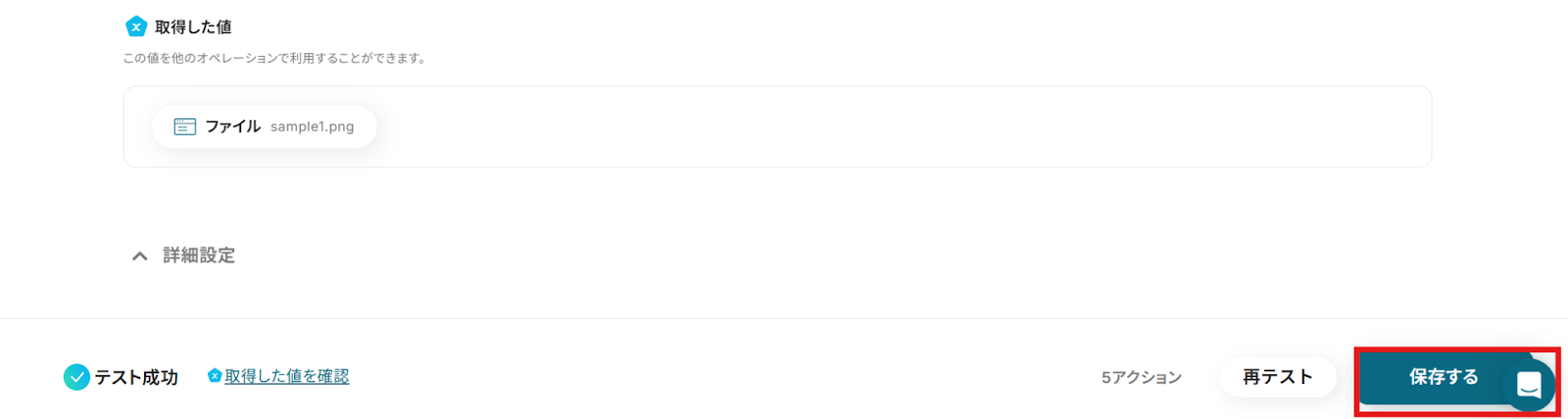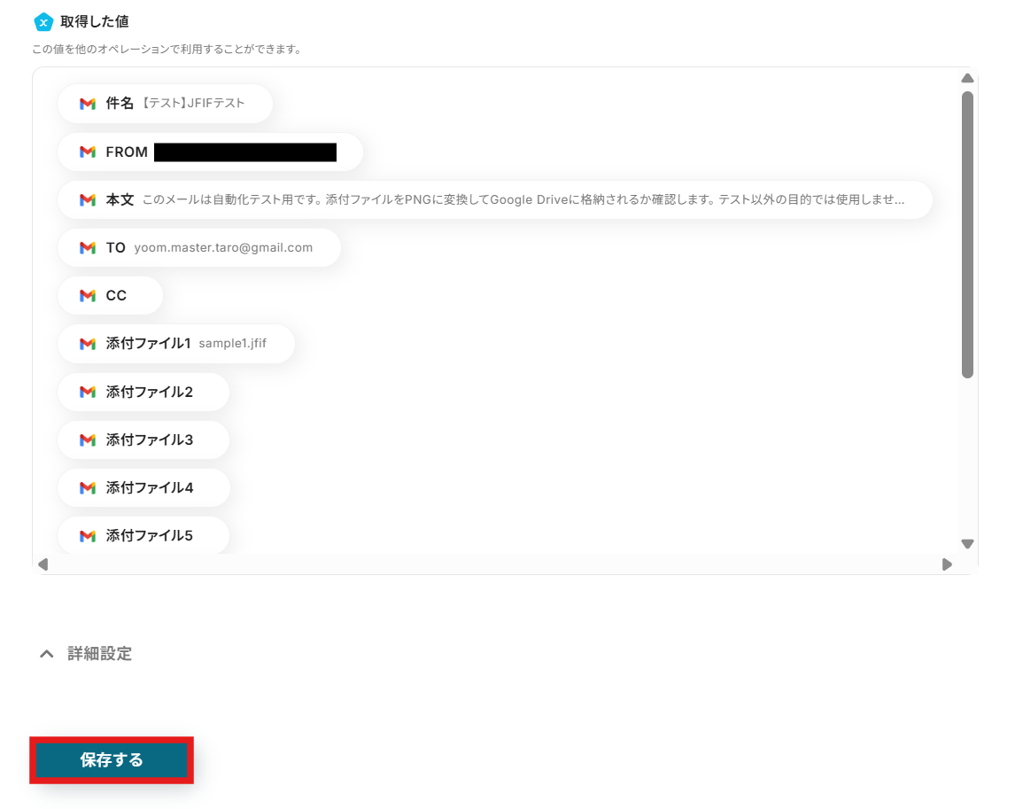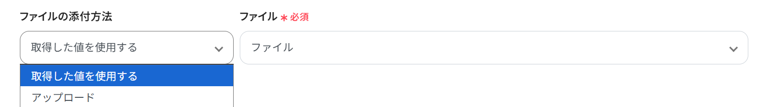 ファイルの添付方法: プルダウンで「アップロード」か「取得した値を使用する」か選択できます。今回は「取得した値を使用」を選択しています。 設定が終わったらテストをしましょう。