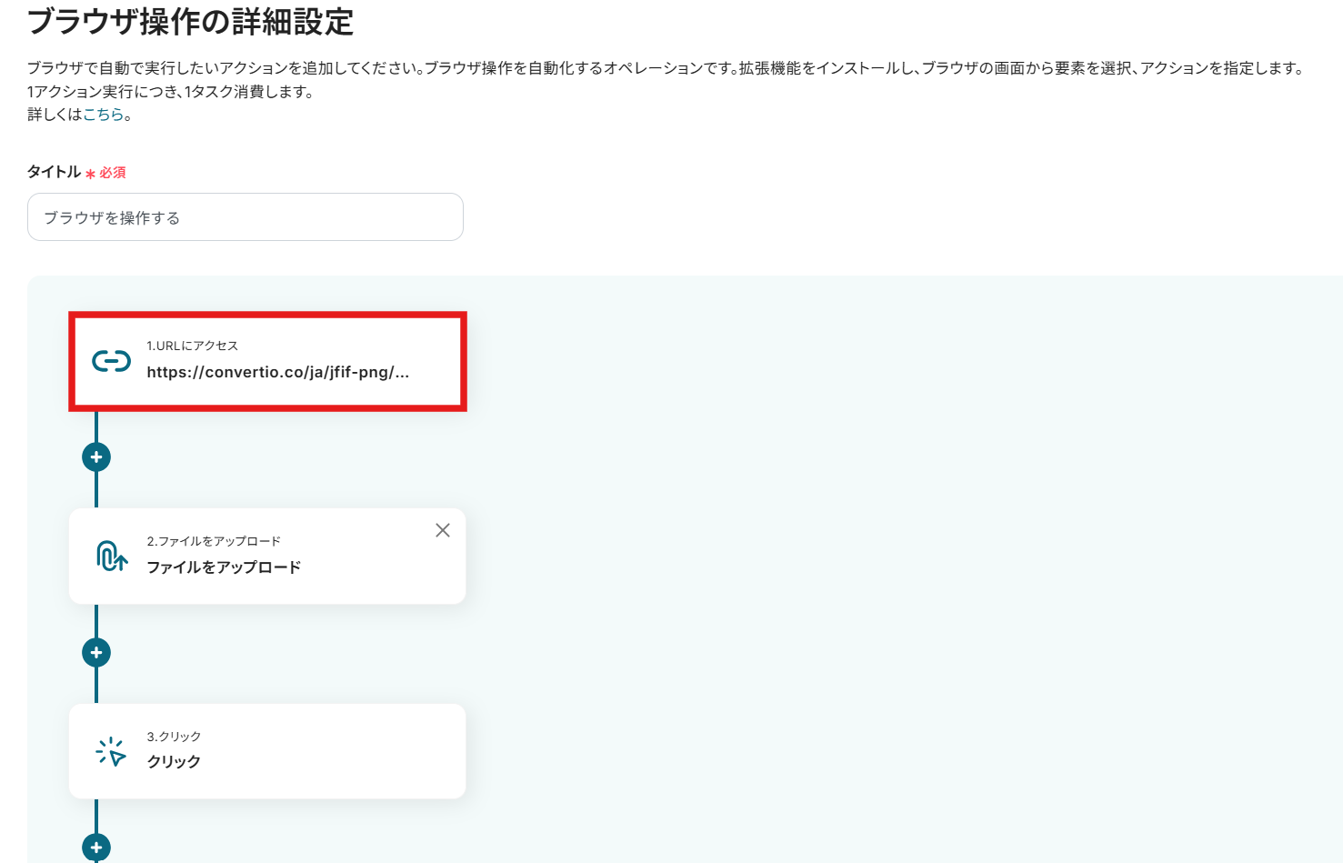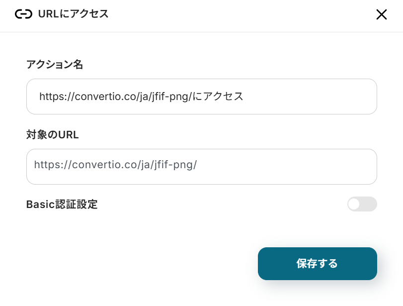 アクション名は任意のものを入力してください。 対象のURLには、PNGへの変換に使うサイトのURLを設定しましょう。今回は操作例として、以下のサイトを使用しています。用途や社内ルールなどに応じてURLをカスタマイズして使ってください。