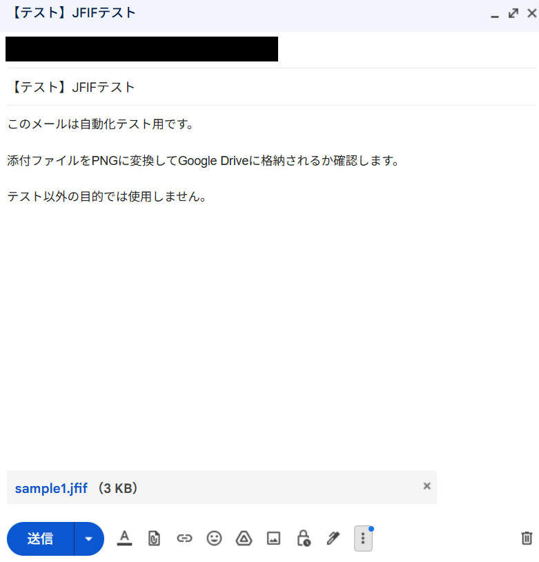 設定が終わったらテストのため、 ラベルの条件に合致するようにメールを送信してください。 その際、ファイルを添付するのを忘れないようにしましょう。 今回はテストとして以下のようなメールを送信しています。