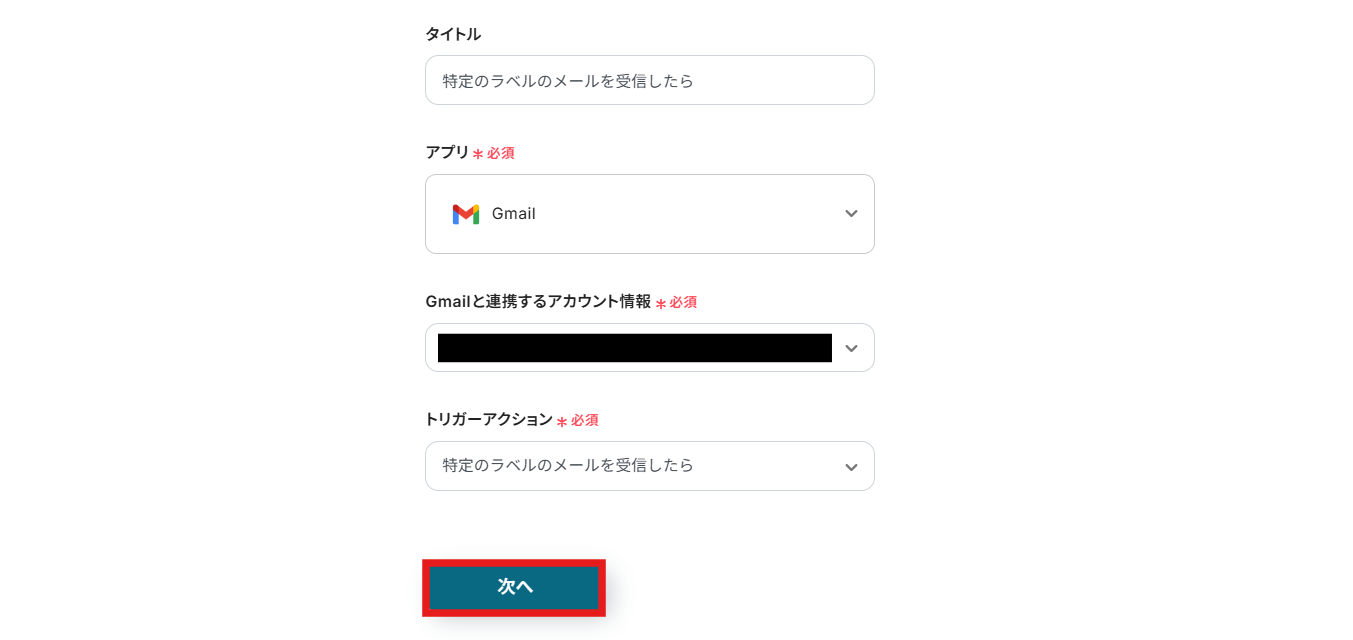 Gmailと連携するアカウント情報はプルダウンから選択します。トリガーには「特定のラベルのメールを受信したら」を選びましょう。 入力が終わったら、「次へ」を押して進めてください。