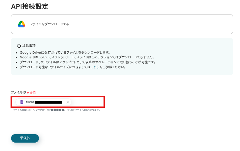 赤枠のファイルIDの箇所に、Googleフォームで送信されたファイル名が入力されます。