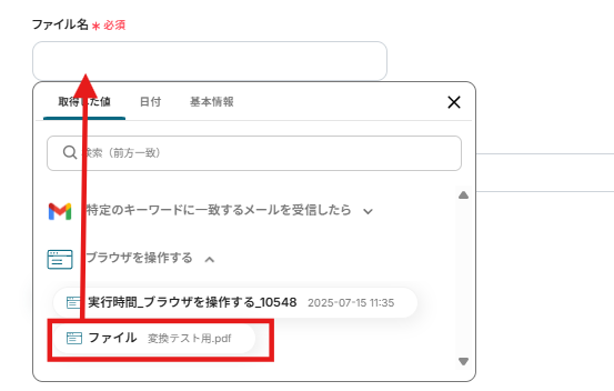 ファイル名は以下のように、取得した値から「ファイル」をクリックし、変換したファイル名を設定します。