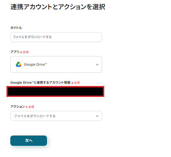 連携アカウントとアクションを選択する画面が表示されるので、今回連携するGoogle Driveのアカウントを確認し「次へ」をクリックします。