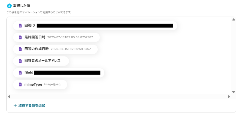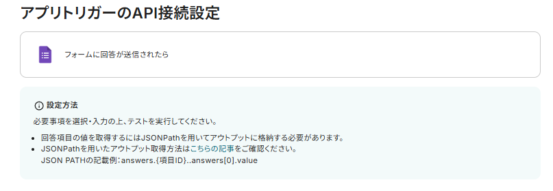 Googleフォームの回答内容を取得するためには、回答項目の値を取得するにはJSONPathを用いてアウトプットに格納する必要があります。