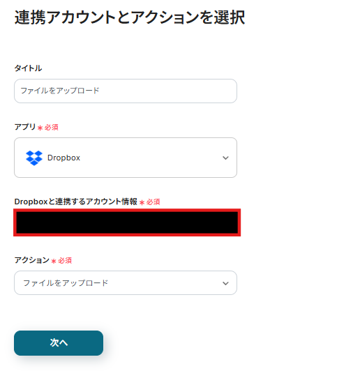 連携アカウントとアクションを選択する画面が表示されるので、今回連携するDropboxのアカウントを確認し「次へ」をクリックします。