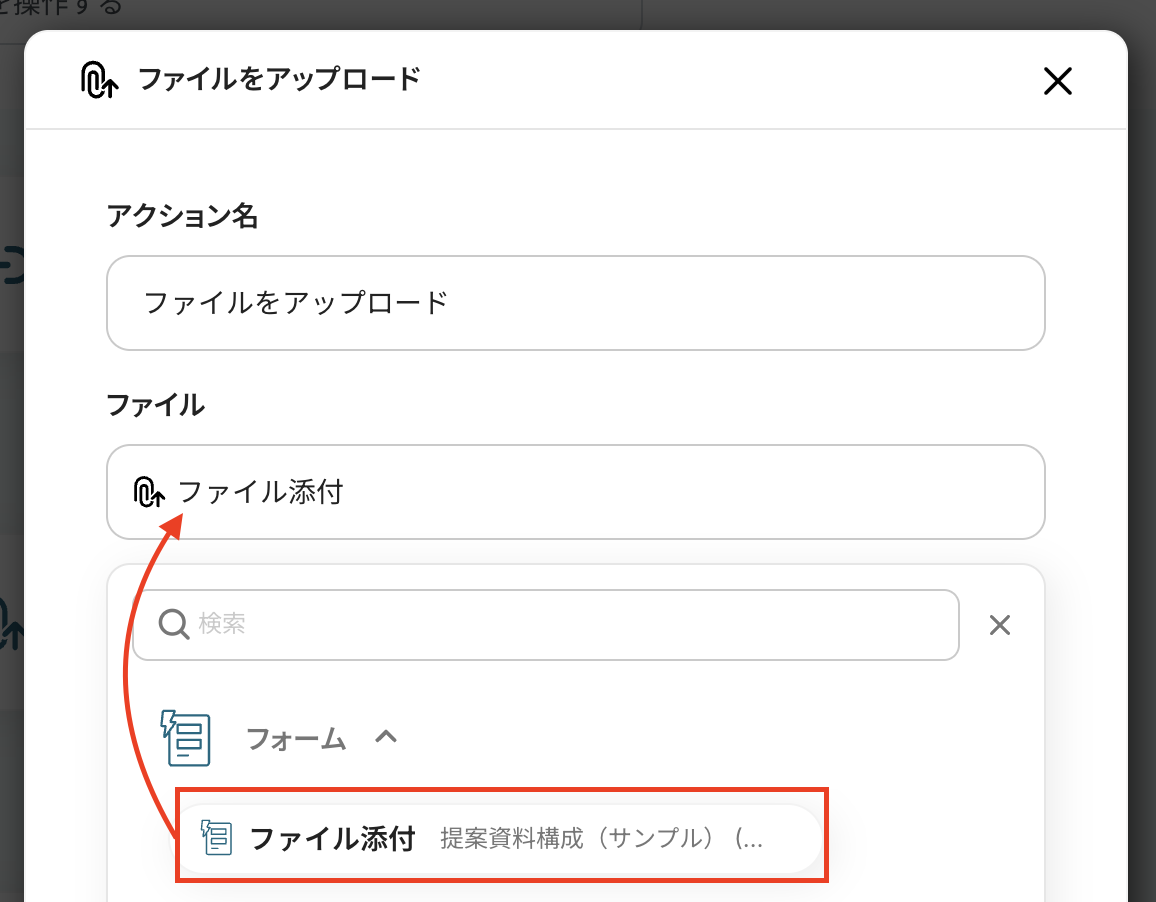 アクション名を任意で設定し、ファイルにはフォームで取得したファイル情報を選択します。