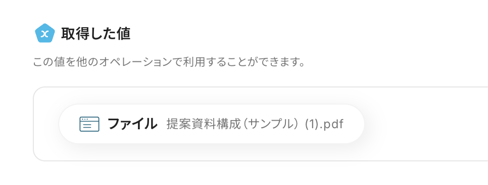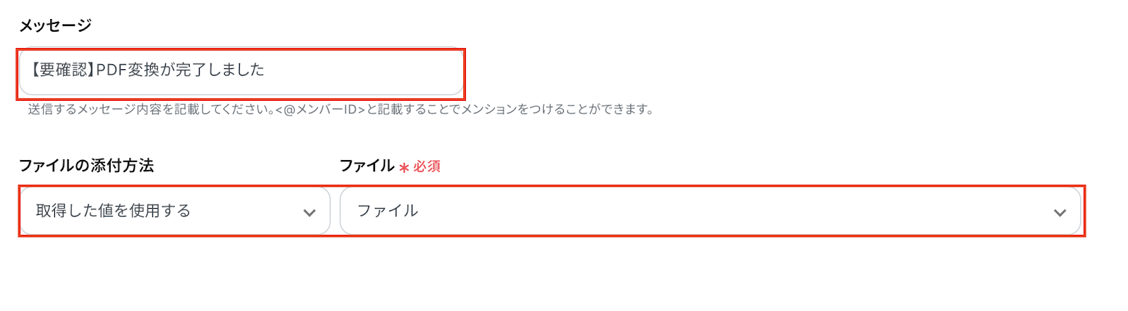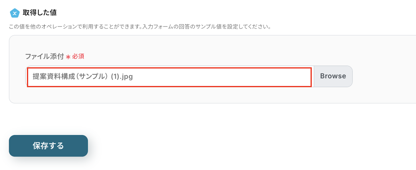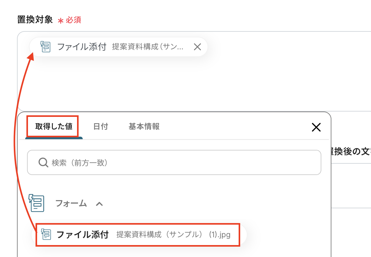 置換対象はフォームの取得した値から「ファイル添付」を選択してください。