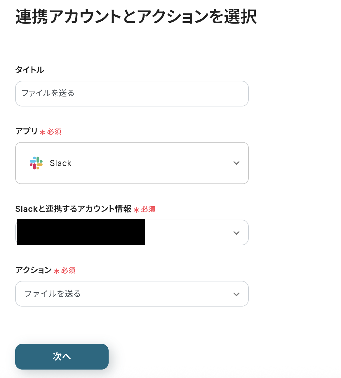 連携アカウントとアクションを選択は設定ができているので、以下を確認し、次へをクリックしましょう。