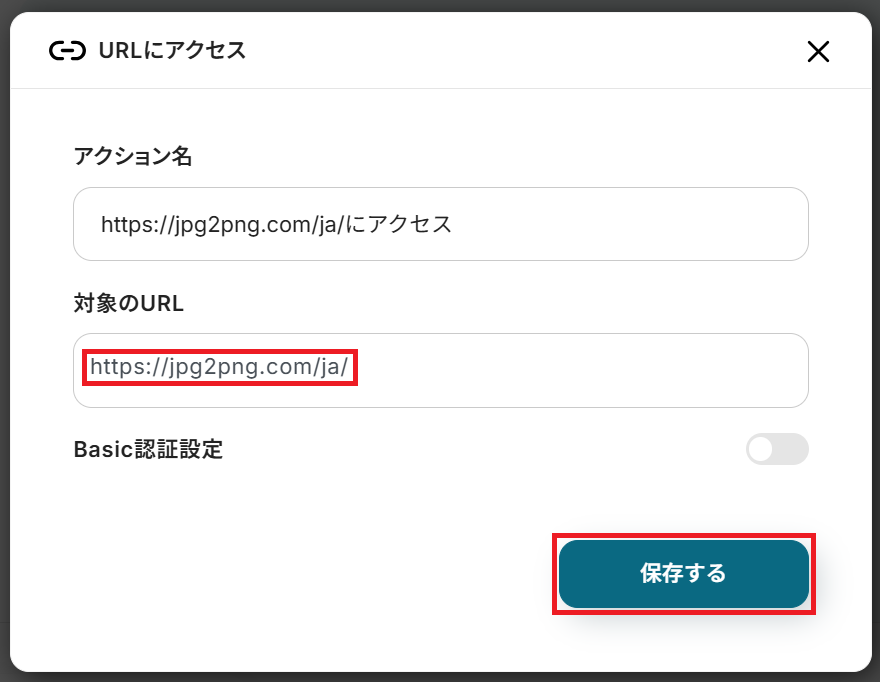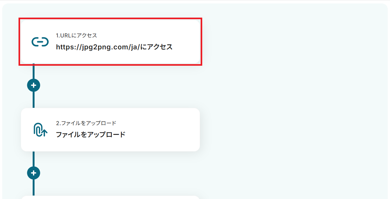 今回は操作例として「JPG PNG 変換」というサイトを使用していますが、用途や社内ルールなどに応じてURLをカスタマイズして使いましょう。 「1.URLにアクセス」をクリックし、任意のアクション名と対象のURLを入力して保存することでカスタマイズできます。