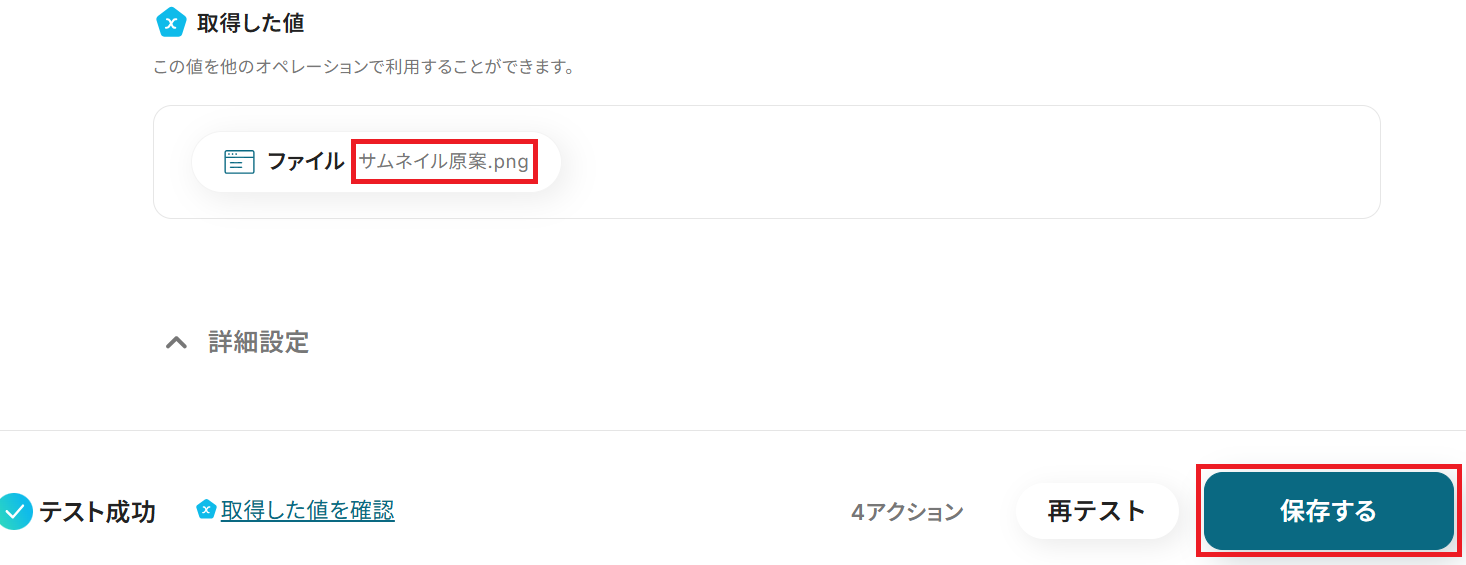 成功したら保存しましょう。ここで取得したアウトプット の値は次のステップで活用します。