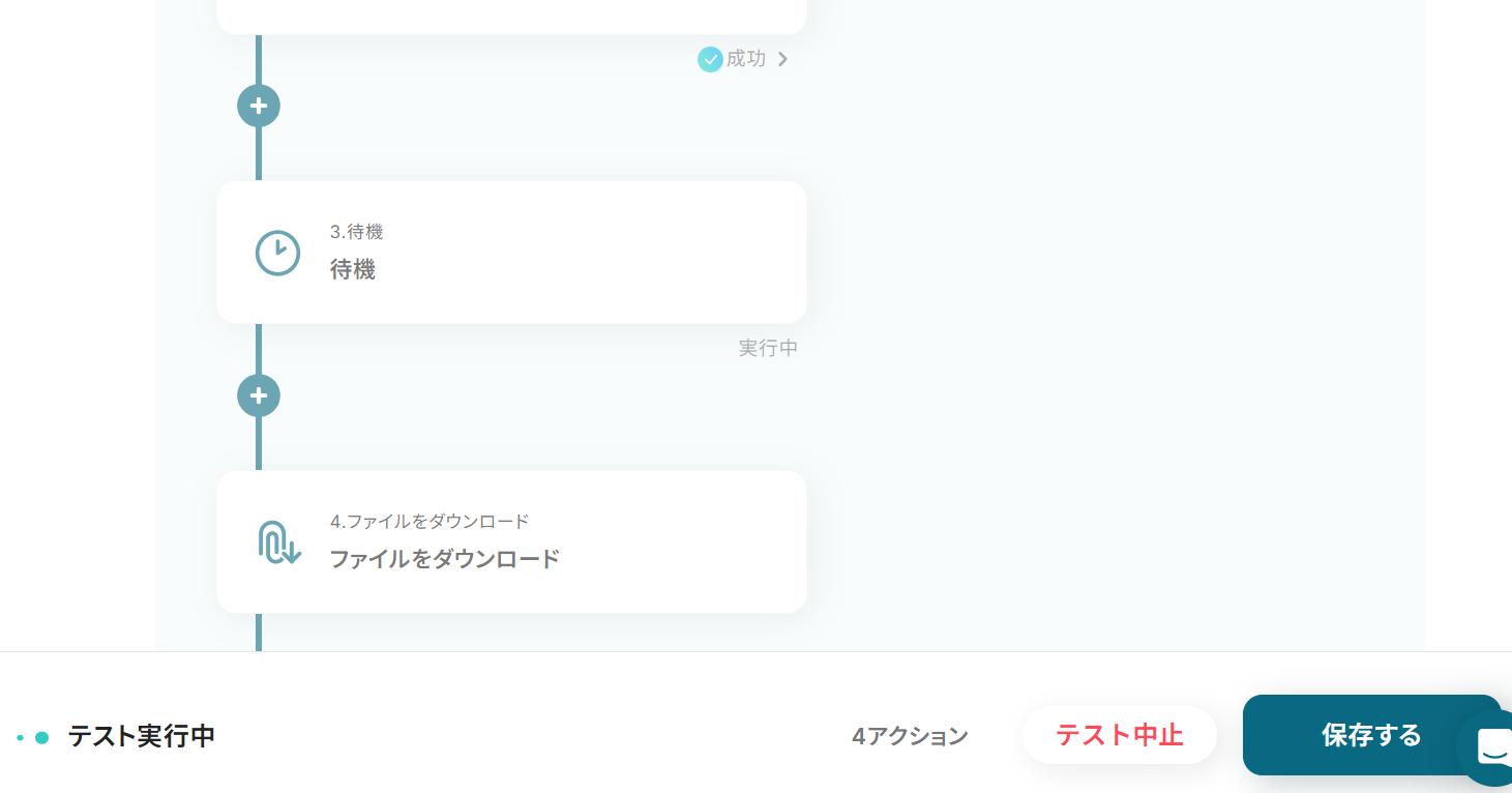 その後のフローは予め設定されているので、そのままテストしてください。 1から順番にテストが実行されていきます。3.待機のアクションは少し時間がかかりますがそのまま待ちましょう。