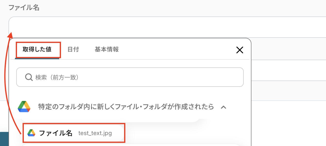 ファイル名はGoogle Driveの取得した値から選択しましょう。