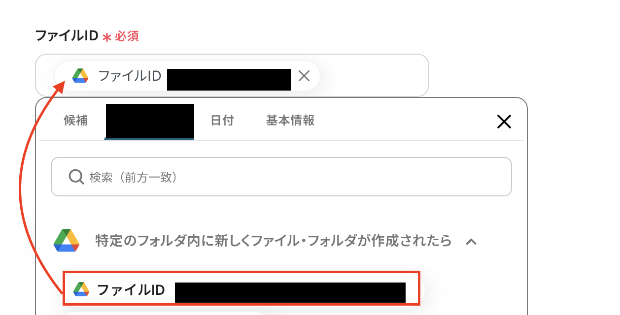 ファイルIDはGoogle Driveのトリガーの取得した値から選択してください。