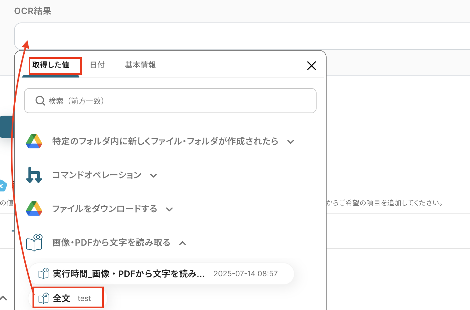 OCRの結果は、文字の読み取りの取得した値から選択してください。