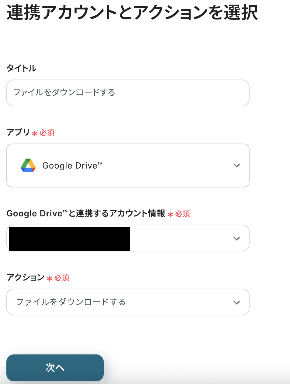 連携アカウントとアクションを選択の画面に進みます。