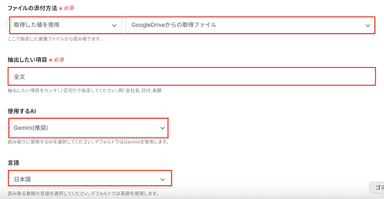 - ファイルの添付方法は「取得した値を使用」「Google Driveからの取得ファイル」を選択します。