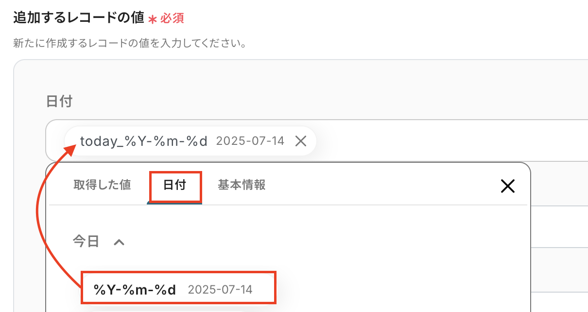 例えば日付を設定したい場合は添付画像のように設定してみましょう。