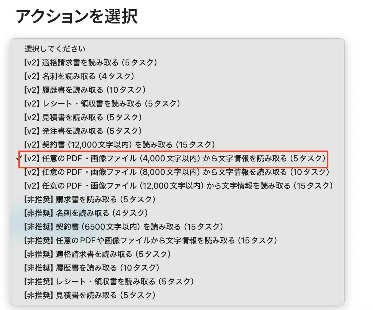 - アクションは「任意のPDF・画像ファイル(4,000文字)から文字情報を読み取る」が選択されています。