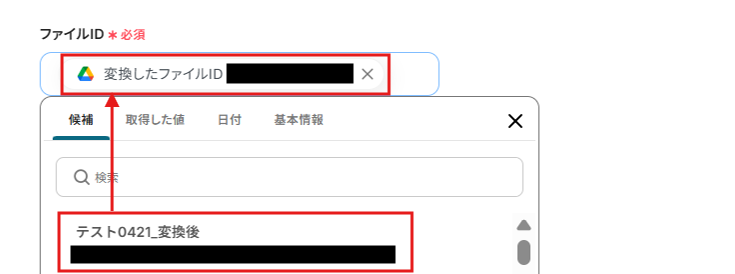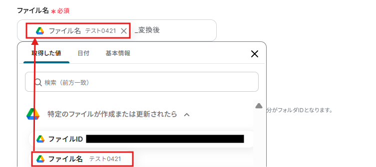 ファイル名は、取得した値の中から選ぶと自動で情報が反映されます。