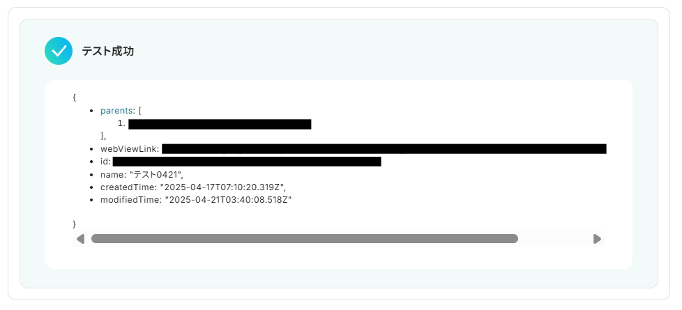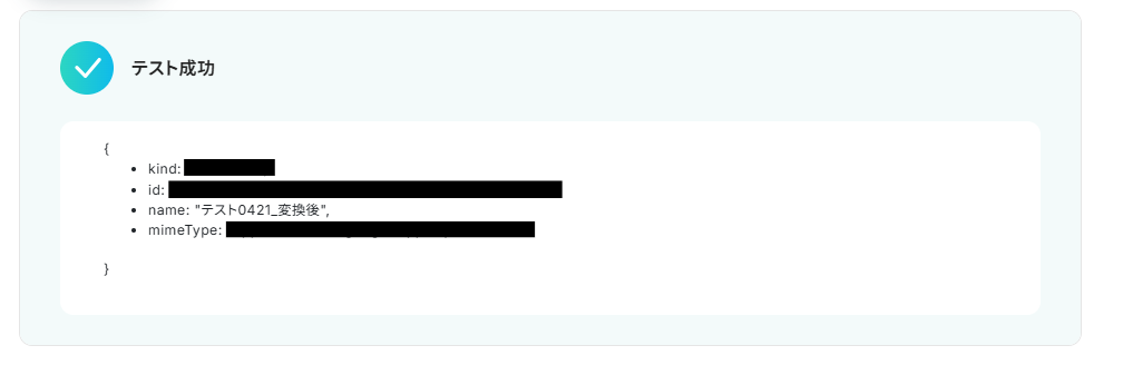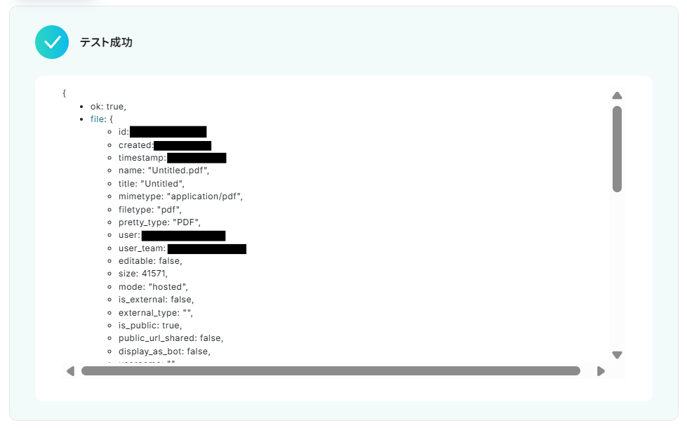 テストが成功したら、以下のようにファイルの情報が取得できます。