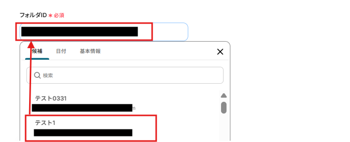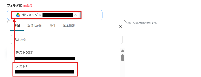 フォルダIDは、候補から選択してください。