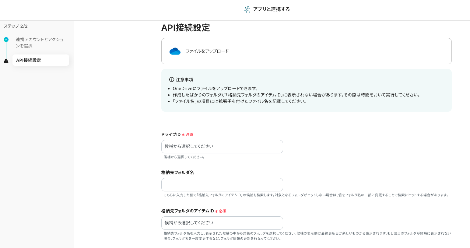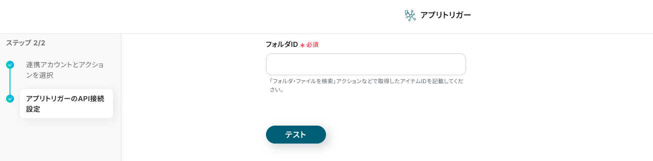 Dropboxのトリガー設定では、自動化の対象としたいフォルダのパスや、特定のファイル名を任意で設定可能です。 Boxへファイルをアップロードするオペレーションでは、格納先のフォルダを示すコンテンツIDを任意で設定可能です。