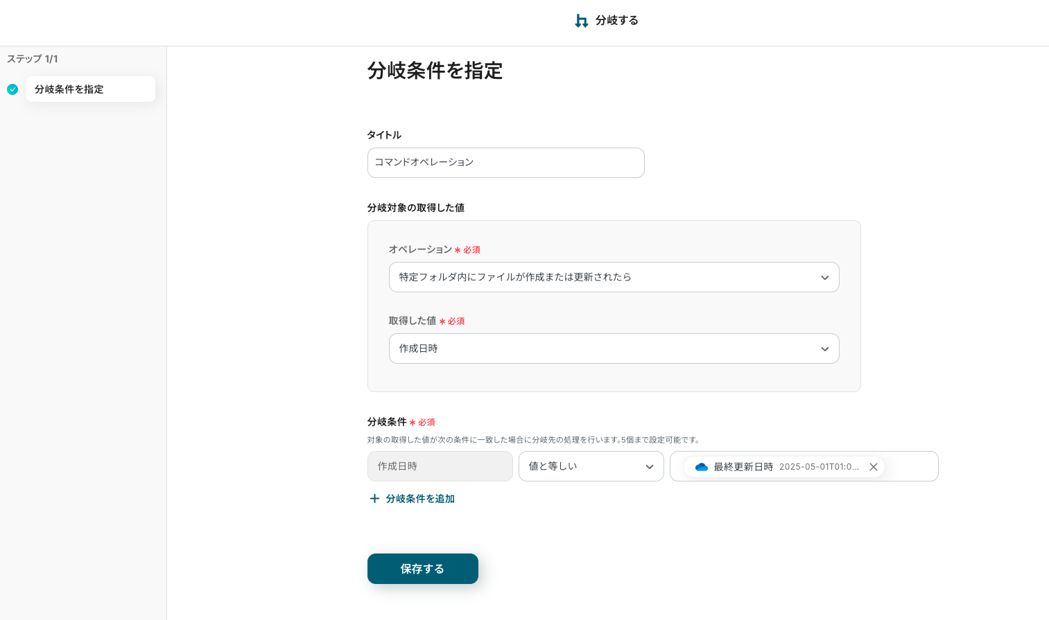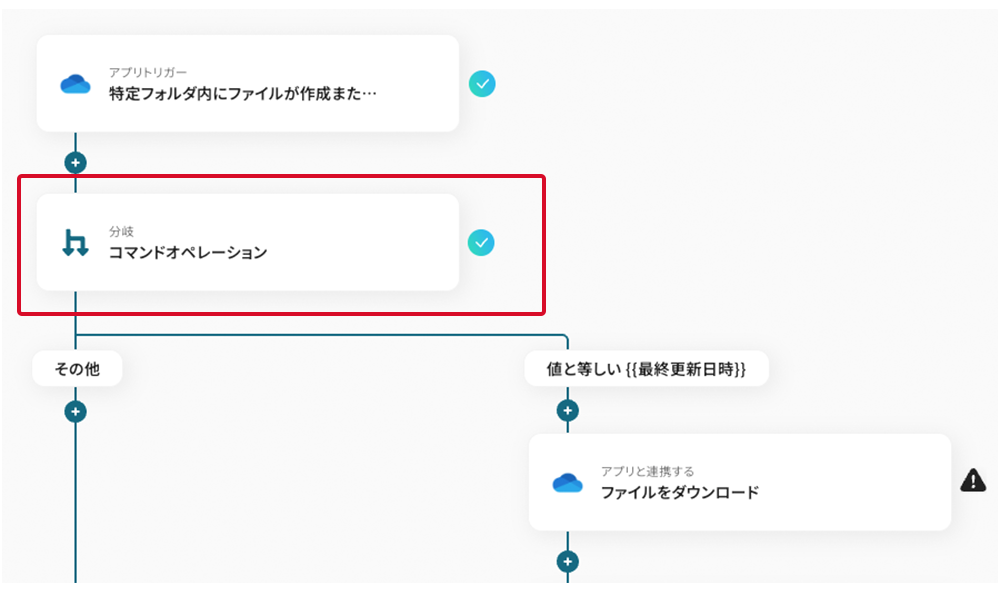 ステップ4:分岐「コマンドオぺレーション」 テンプレートの2つ目をクリックします。この工程では、作成日時を条件にPDFに変換する・しないを判断するための設定を行います。