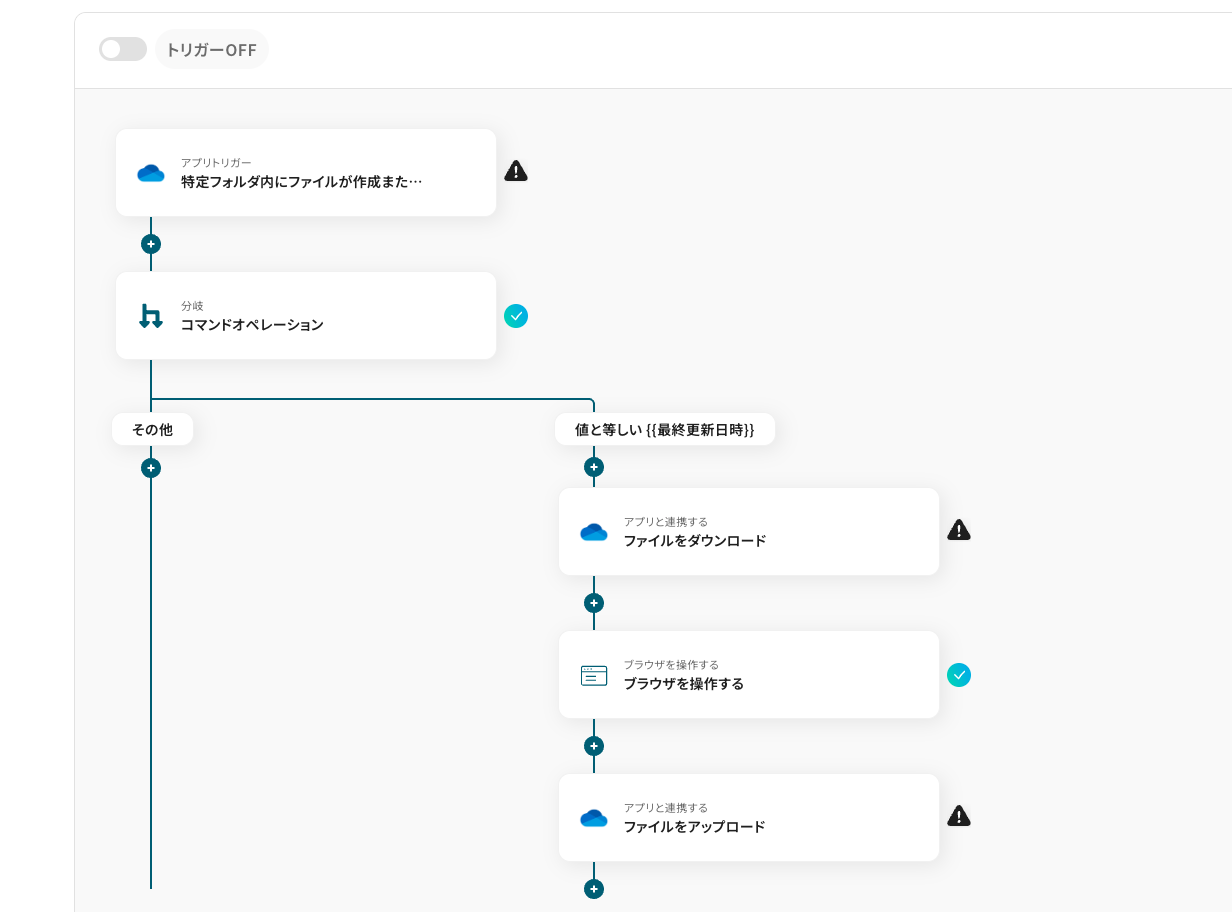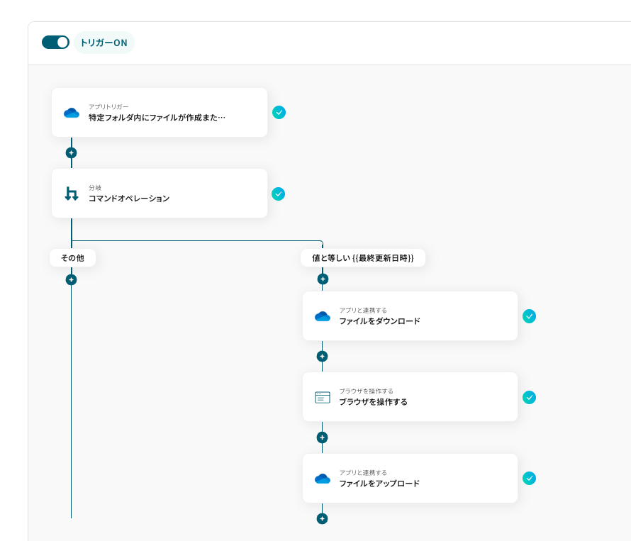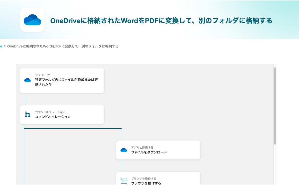 OneDriveなどの特定のストレージサービスにMicrosoft Wordファイルがアップロードまたは更新されたことをトリガーとし、自動でPDFに変換して別のフォルダに格納する 設定が可能です。 チーム内でのファイル共有や版管理が必要な場面で、常に最新のPDF版を用意しておくといった運用を自動化できますよ!