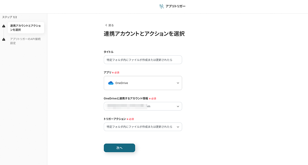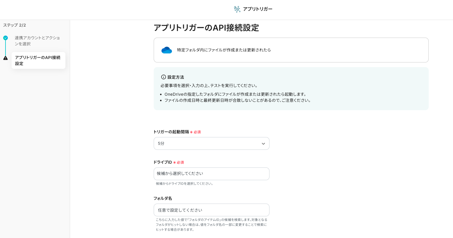 トリガー(OneDrive - 指定フォルダにファイルが追加されたら)の設定