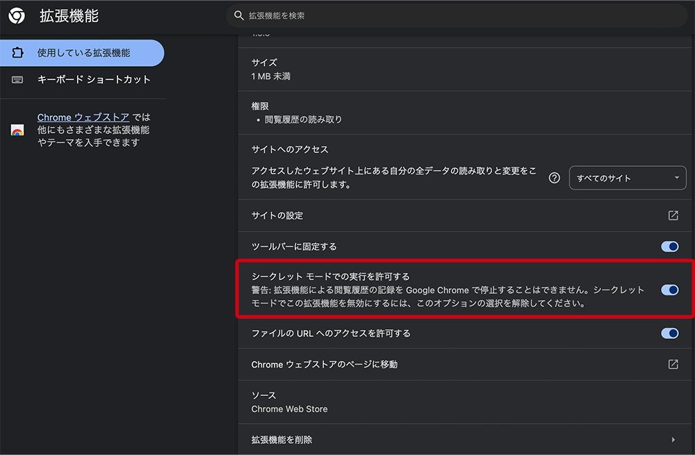 Chromeの拡張機能を追加したら、拡張機能の管理からシークレットモードの実行を許可するようオンに設定してください。
