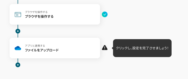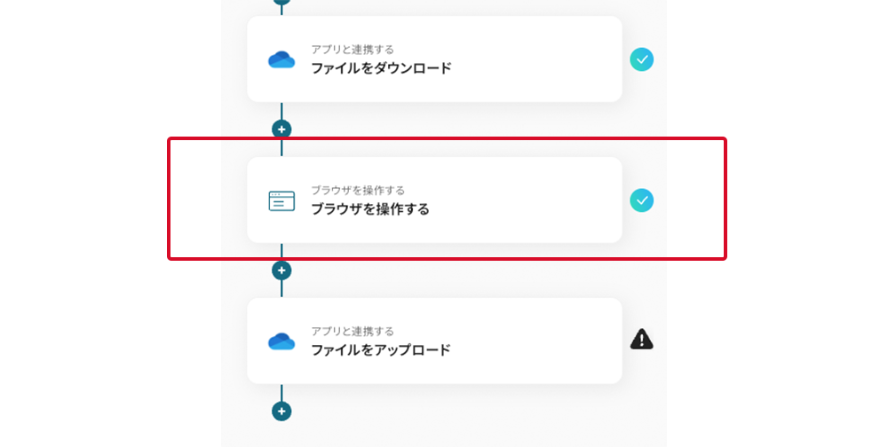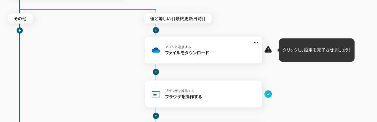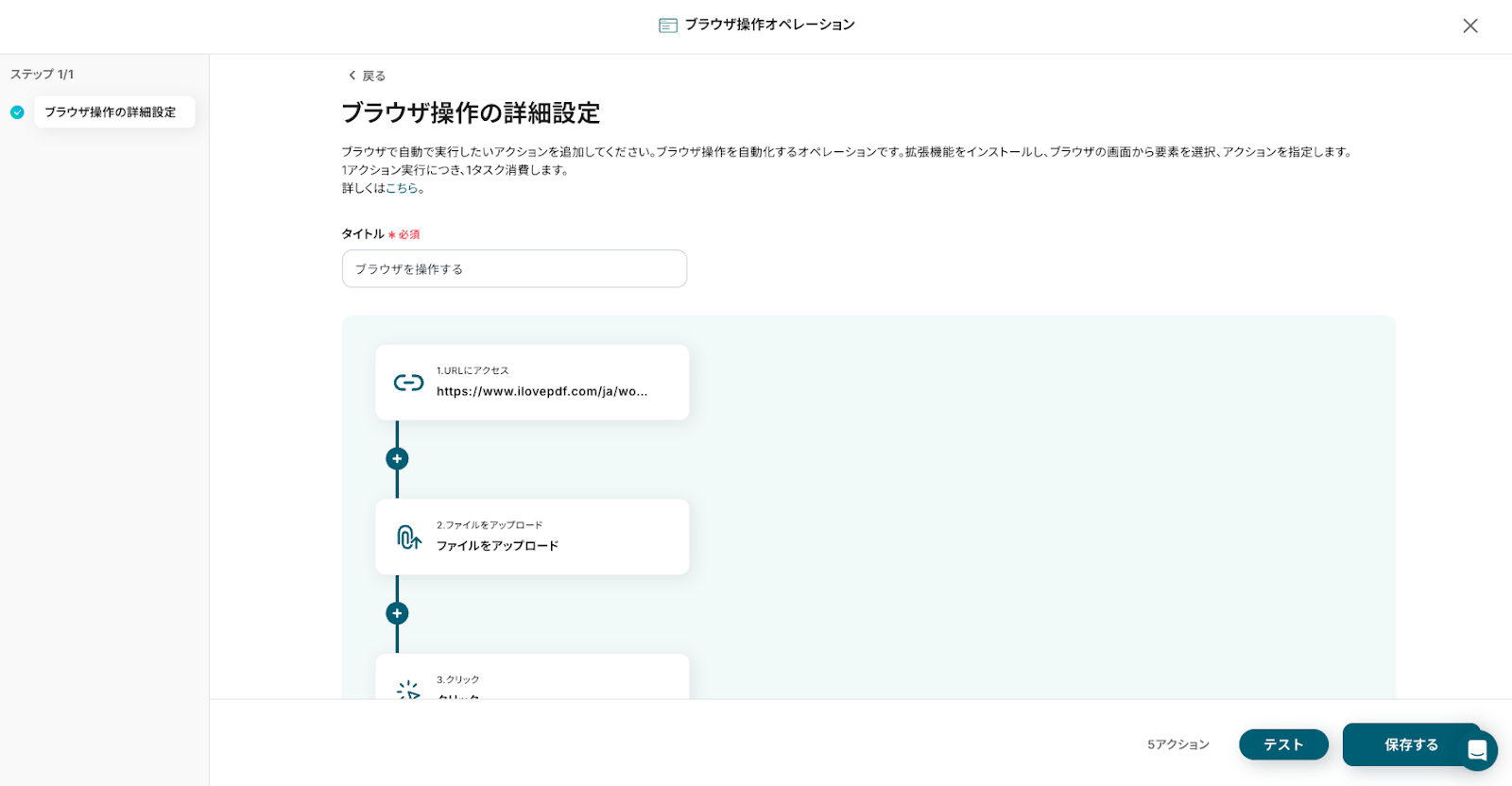 分岐オペレーションでは、特定のファイル形式のみを対象とするなど、後続の処理を実行するための条件を任意で設定してください。 AIによるブラウザ操作のオペレーションでは、PDF変換に使用するWebサイトのURLなど、自動操作の対象を任意で設定してください。 ■注意事項