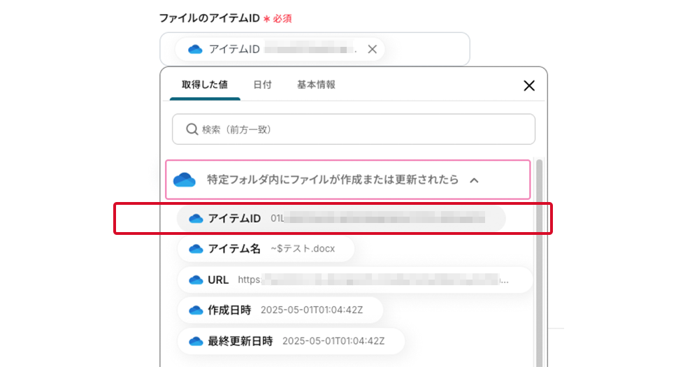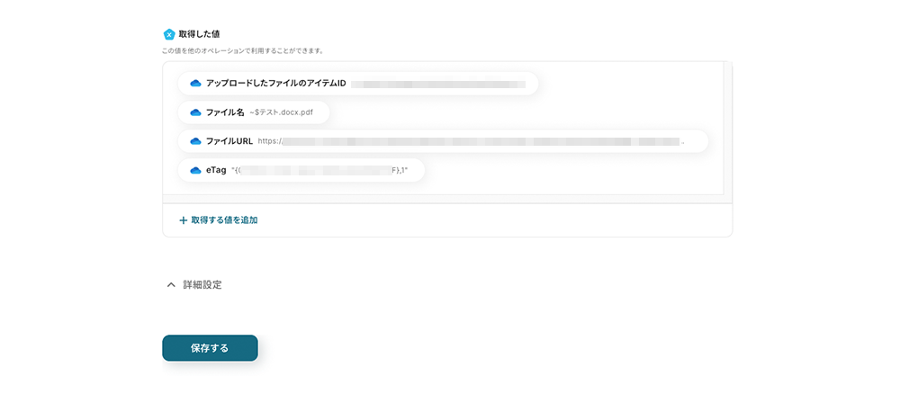 ※取得した値 とは? トリガーやオペレーション設定時に、「テスト」を実行して取得した値のことを指します。 後続のオペレーション設定時の値として利用でき、フローボットを起動する度に変動した値となります。