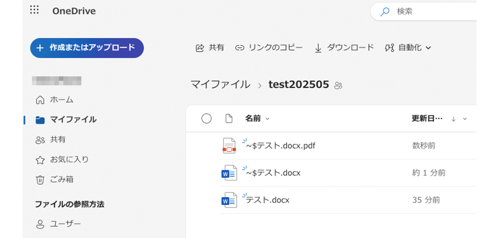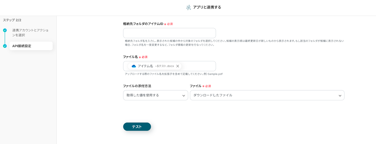 指定したフォルダに、テスト用にMicrosoft Wordファイルをアップロードしてください。 ファイルが空・もしくはファイルをアップロードして1時間以上経つ場合はファイルを検知できずエラーになります。