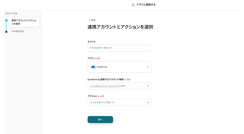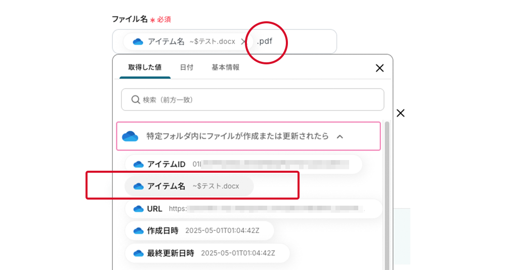 アクション(データ変換 - Microsoft WordをPDFに変換、OneDrive - 指定フォルダにファイルをアップロード)の設定