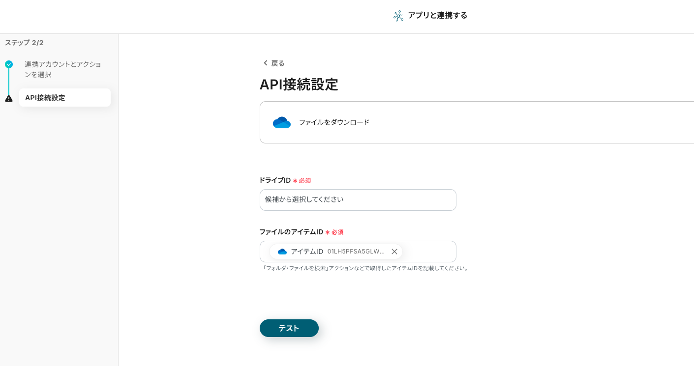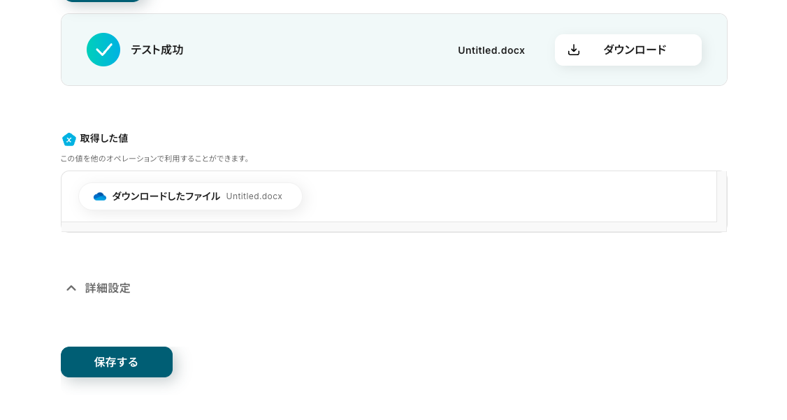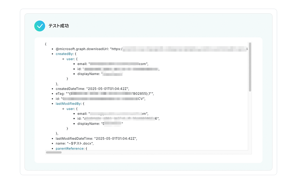 これは、YoomがOneDriveに正しくつながり、指定のMicrosoft Wordファイル(.docs)の情報が問題なく取得できていることを示すテスト結果です。 【ダウンロード可能か:はい、可能です(is_downloadable: true)】と記載されています。